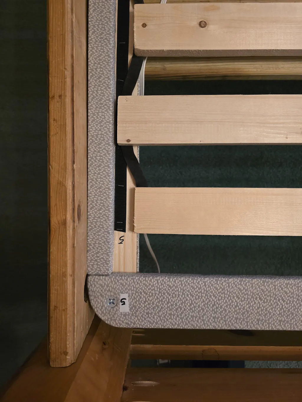 Starting at each end at the head and the foot, with the hook & loop tape on the Slat Rolls facing down, unroll the Slats toward the middle, pressing them firmly onto the hook & loop on the inside Side Rail ledge.